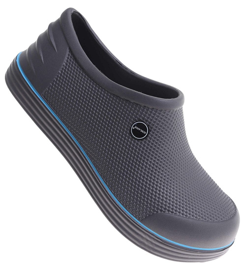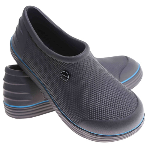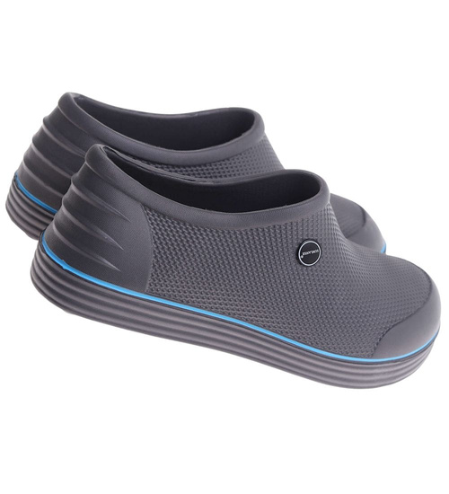 Szare damskie kalosze piankowe z niebieskim paskiem to praktyczne i lekkie obuwie, stworzone z myślą o wygodzie w deszczowe dni.
