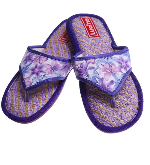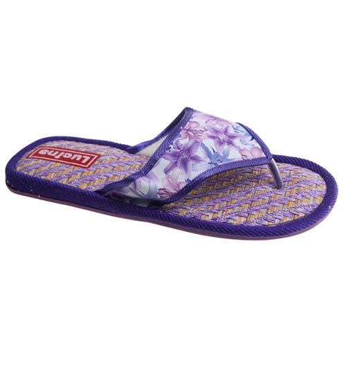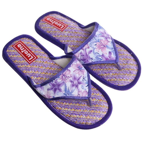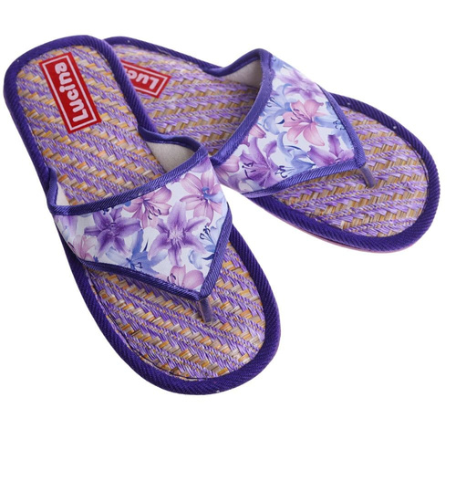 Damskie kapcie domowe typu japonki – fioletowe z kolorowym wzorem