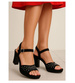 - Letnie damskie sandały z otwartymi noskami postawione na słupku i platformie w klasycznym, czarnym kolorze.