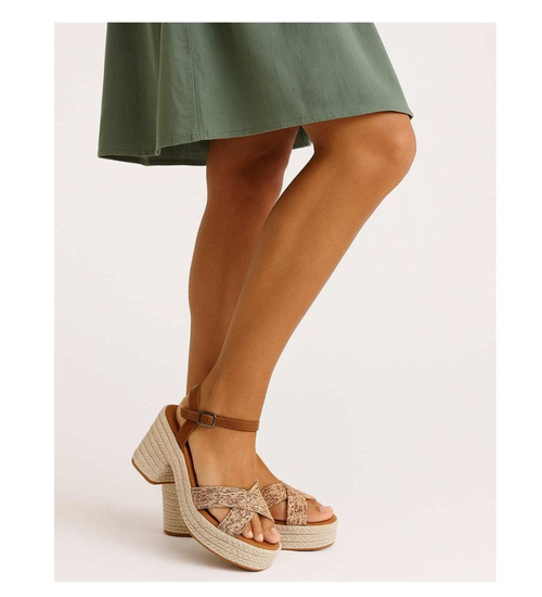 • Brązowo beżowe sandały na koturnie to modna propozycja do wakacyjnych stylówek.