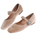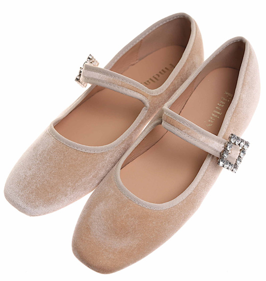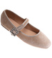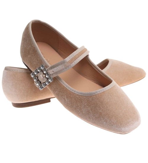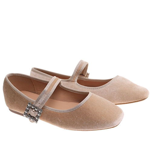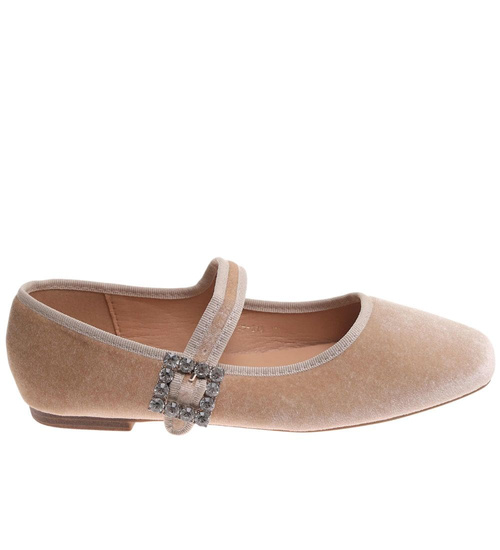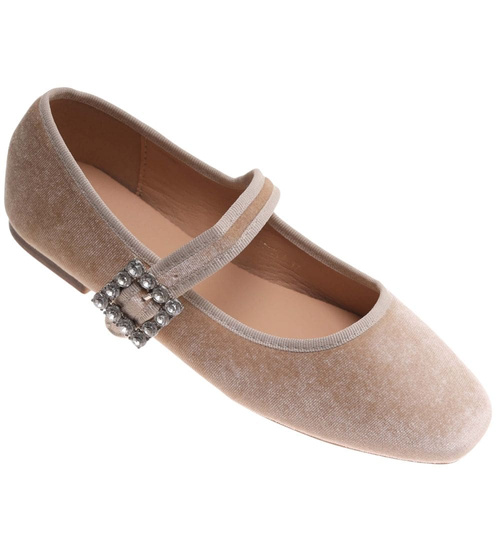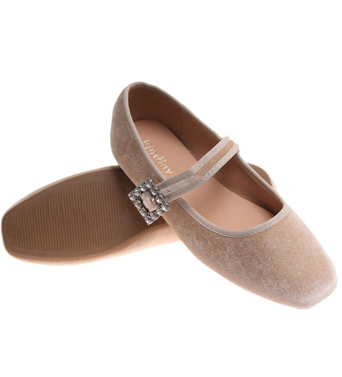 - Beżowe baleriny z paskiem baleriny wykonane z miękkiego zamszowego materiału.