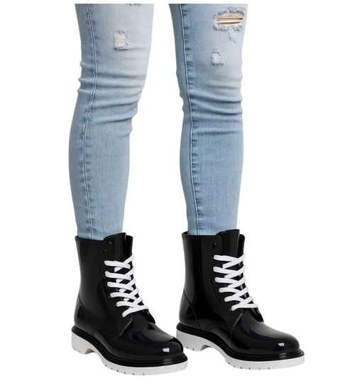 - Damskie czarne kalosze z wiązaną cholewką- praktyczne, lekkie buty gotowe na deszczową aurę.