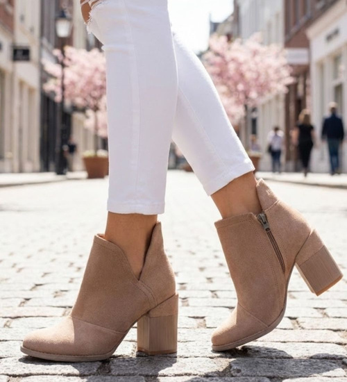 • Modne damskie botki w nietuzinkowym wydaniu wykonane z zamszowego materiału w kolorze khaki wpadającym w beżowy.