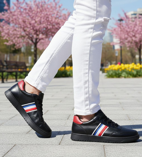 Praktyczne trampki męskie wykonane miękkiego materiału skóropodobnego to doskonały wybór do wiosennych, miejskich stylizacji. Ponadczasowy czarny kolor przełamany został efektownymi, kolorowymi paskami po bokach, co nadaje butom nowoczesny, sportowy charakter.