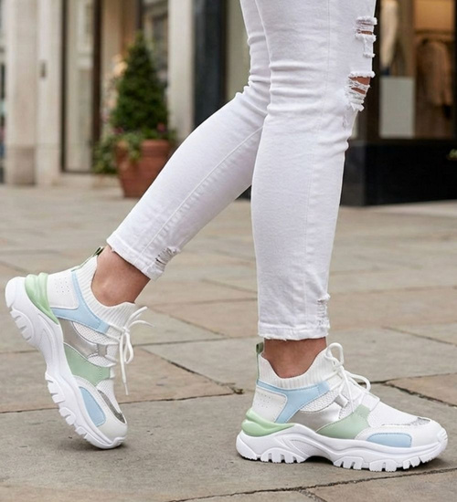 - Model wyróżnia się białym wierzchem urozmaiconym kolorowymi akcentami w odcieniach zieleni, srebra i błękitu.