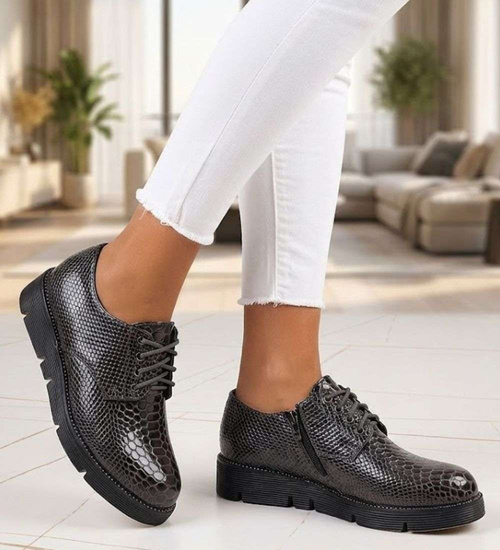 - Półbuty wykonane z lakierowanego materiału skóropodobnego w modnym, szarym kolorze.