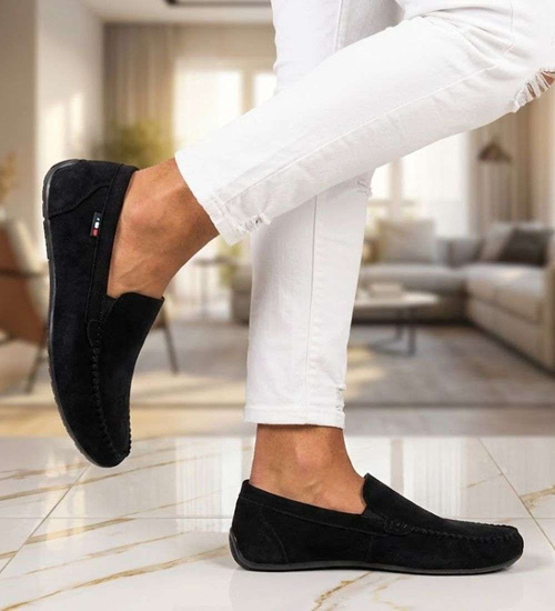 Czarne pantofle do garnituru- zamszowe mokasyny na wiosnę