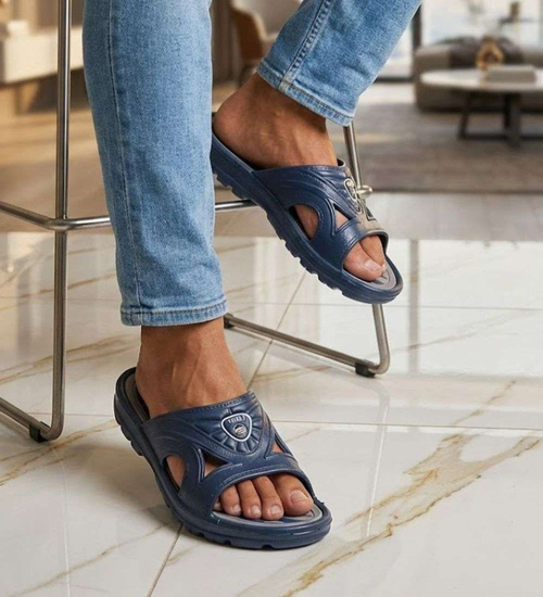 - Granatowe klapki wykonane z lekkiego materiału gumowo-piankowego to praktyczne obuwie do użytkowania w wilgotnym środowisku.