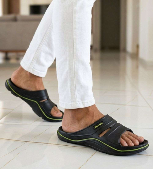 Praktyczne i lekkie- te czarne klapki męskie to niezbędnik każdego aktywnego mężczyzny. Wykończone kontrastującą, zieloną linią, łączą w sobie sportowy design z maksymalną funkcjonalnością. Idealne na basen, plażę czy do ogrodu.