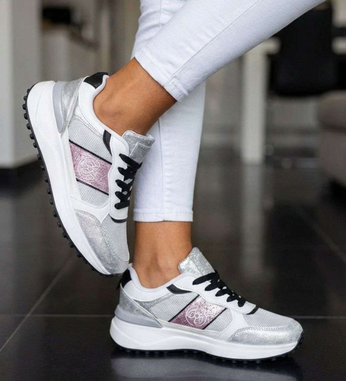 Białe sneakersy damskie ze srebrnymi i różowymi dodatkami
