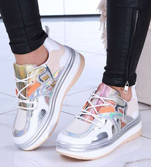 Wiązane srebrne sneakersy z wysoką cholewką /D1-3 14719 T282/