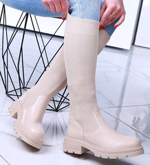 Beżowe kozaki damskie na platformie z elastyczną cholewką / E6-3 15306 T792/