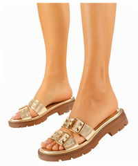 Złote klapki klamerki na niskiej platformie /G8-3 17661 G289/