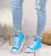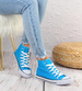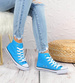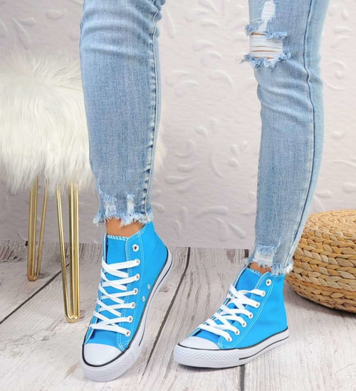 • Klasyczne damskie trampki z wysoką cholewką wykonane z miękkiej tkaniny w kolorze niebieskim.