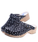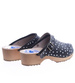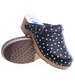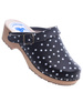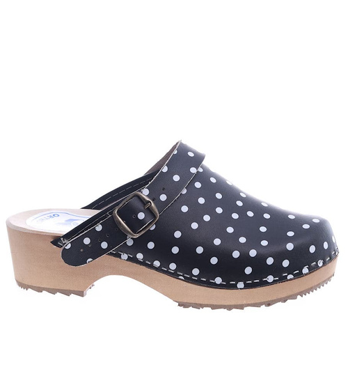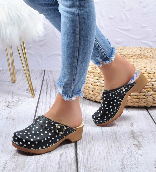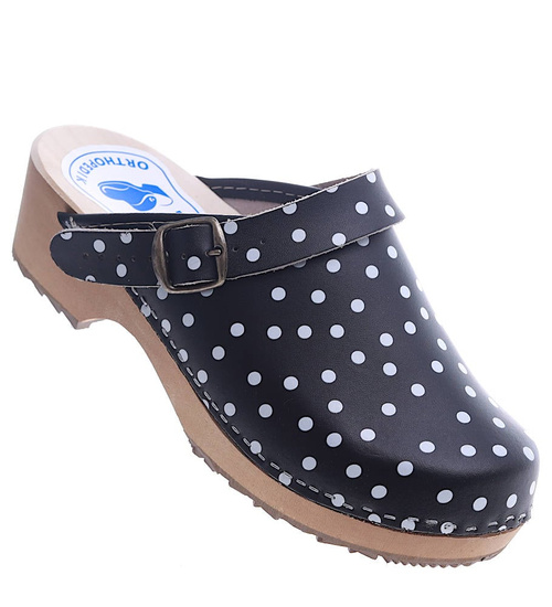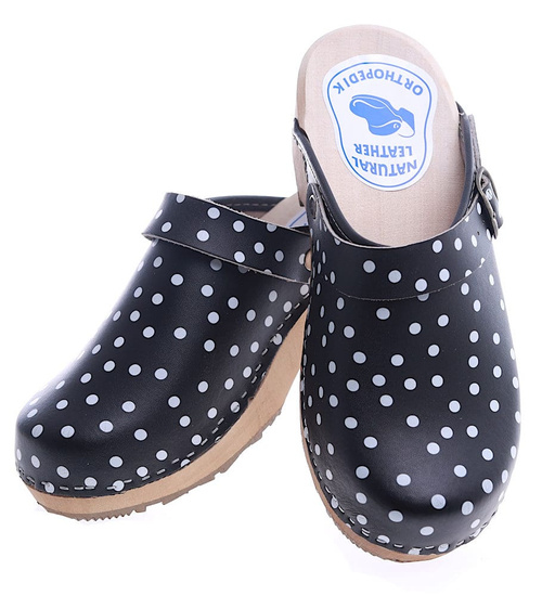 - Ortopedyczne drewniaki damskie wykonane z czarnej skóry naturalnej z printem w formie kropek.