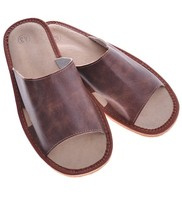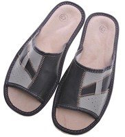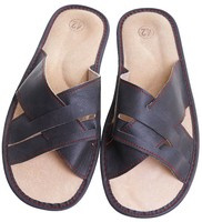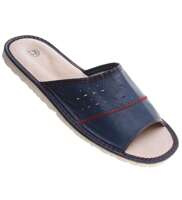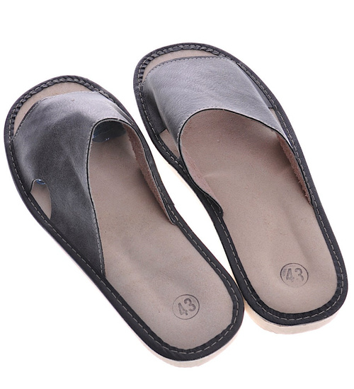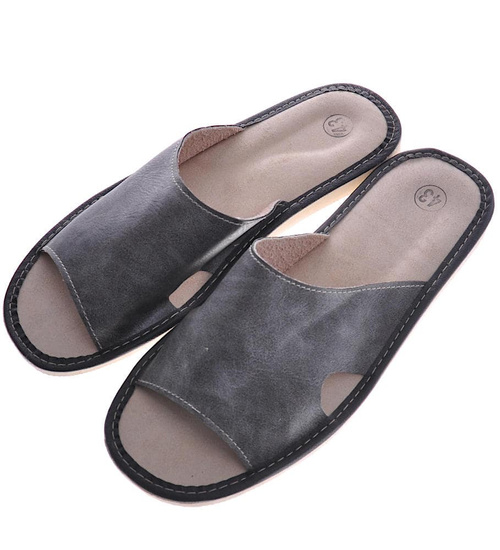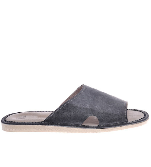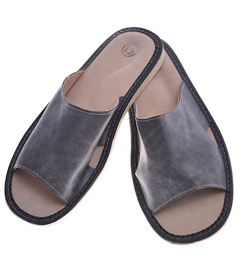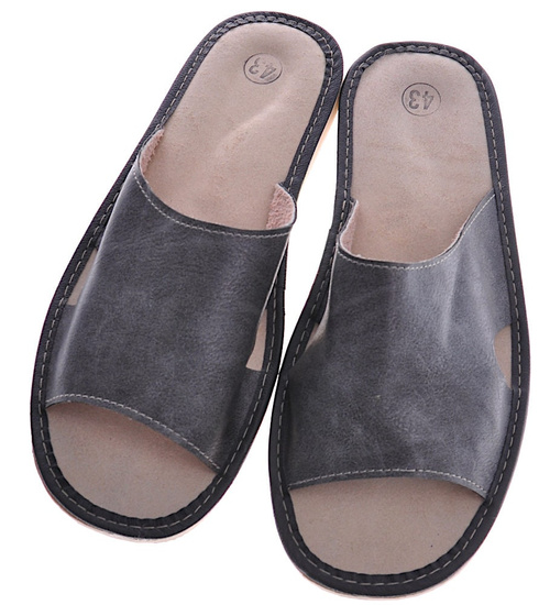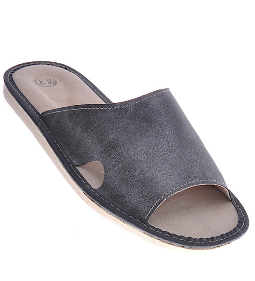 - Szare męskie klapki wykonane z naturalnej skóry- solidnie wykonane, wygodne domowe buty.