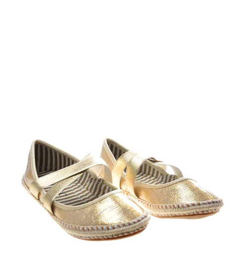 - Modne balerinki dziewczęce wykonane z błyszczącego materiału tekstylnego w kolorze złotym.