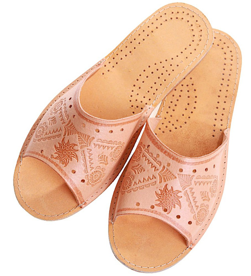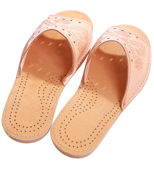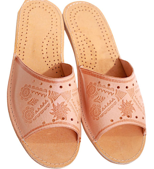 - Wierzch tych regionalnych pantofli wykonany został z naturalnej skóry, wytłoczono na nim charakterystyczny wzór.