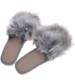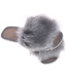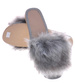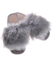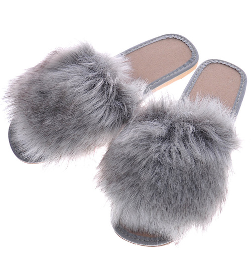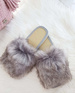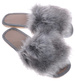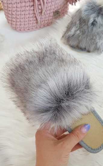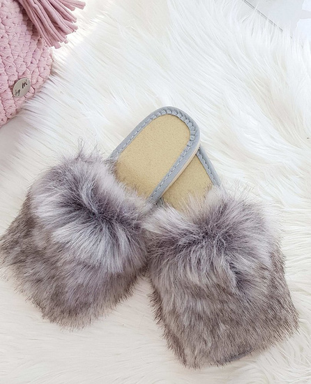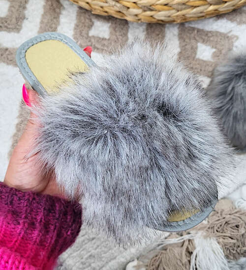- Efektowne damskie klapki z futerkiem w kolorze szarym.