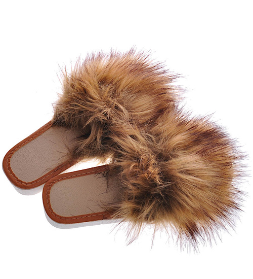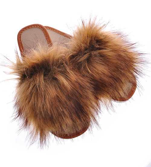 - Domowe klapki z obfitym futerkiem w cieniowanym, rudym kolorze.