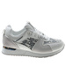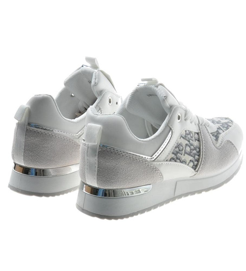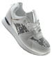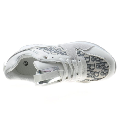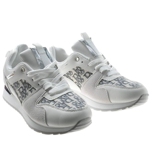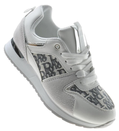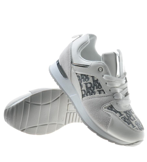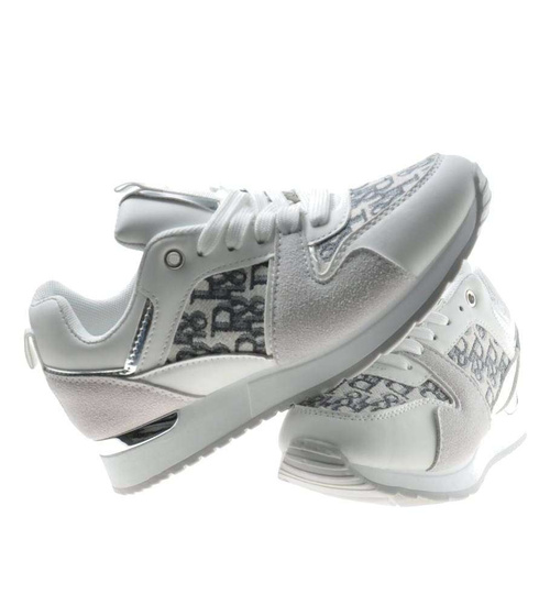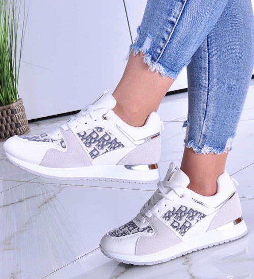 - Designerskie buty sportowe w kolorze białym z szarymi dodatkami.