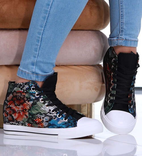 Wysokie sznurowane trampki na niskim koturnie Flower Black /F4-2 8087 S190/