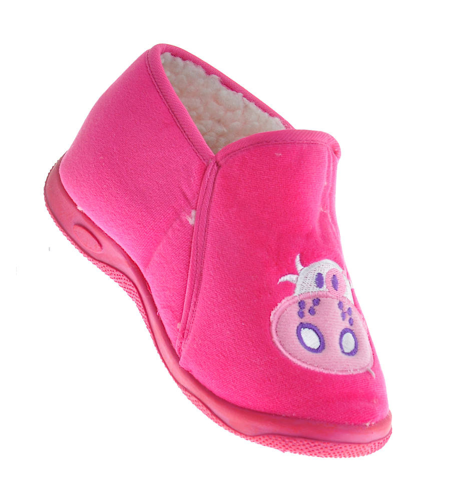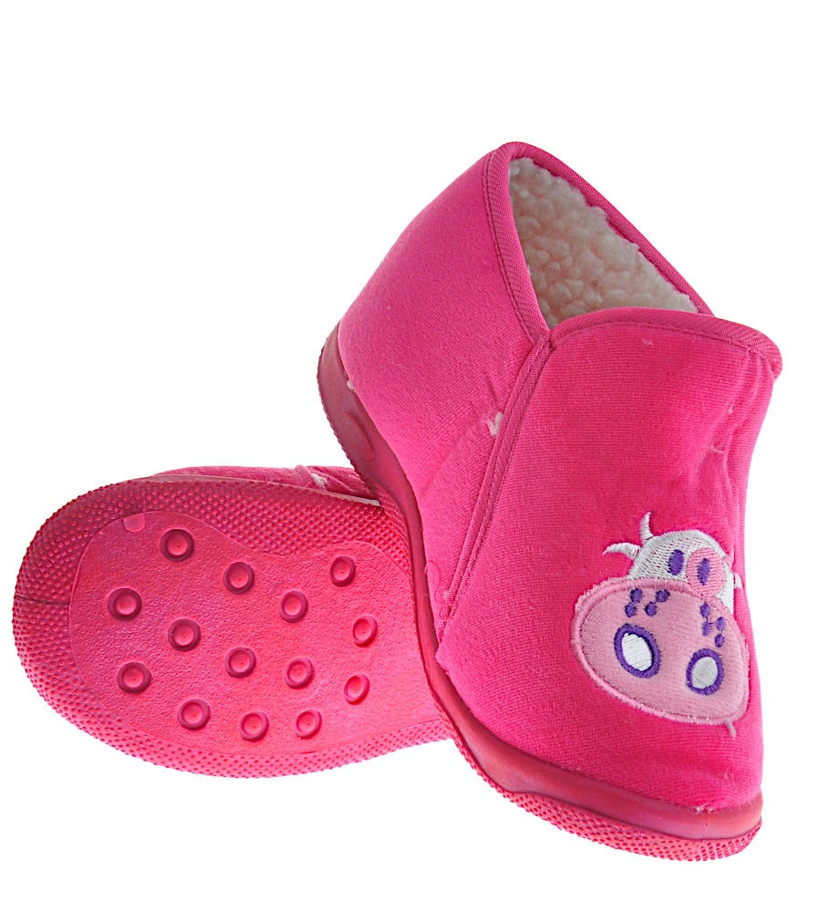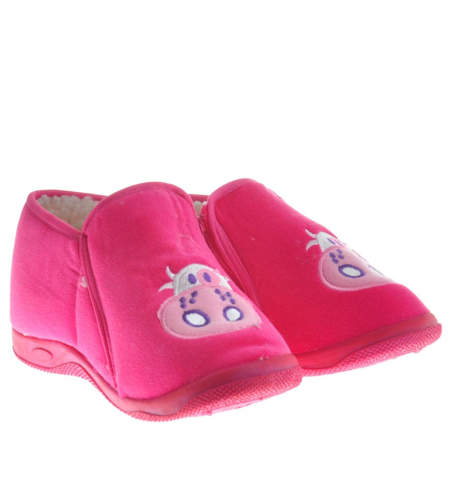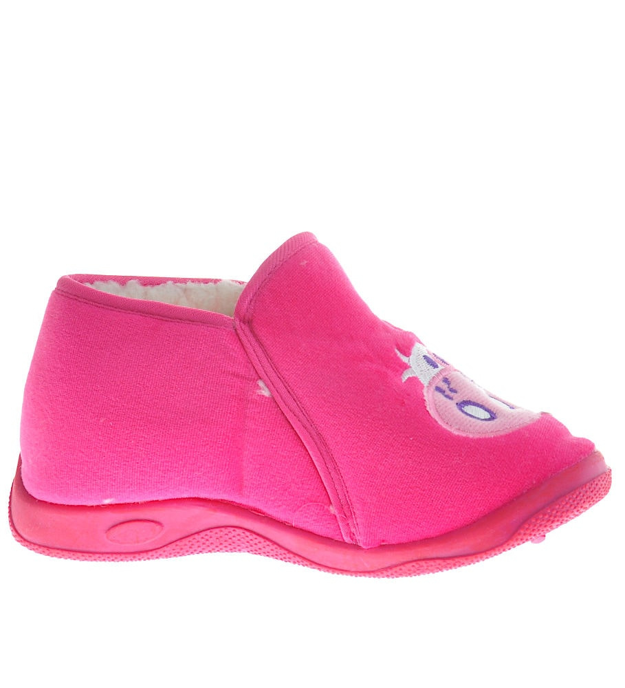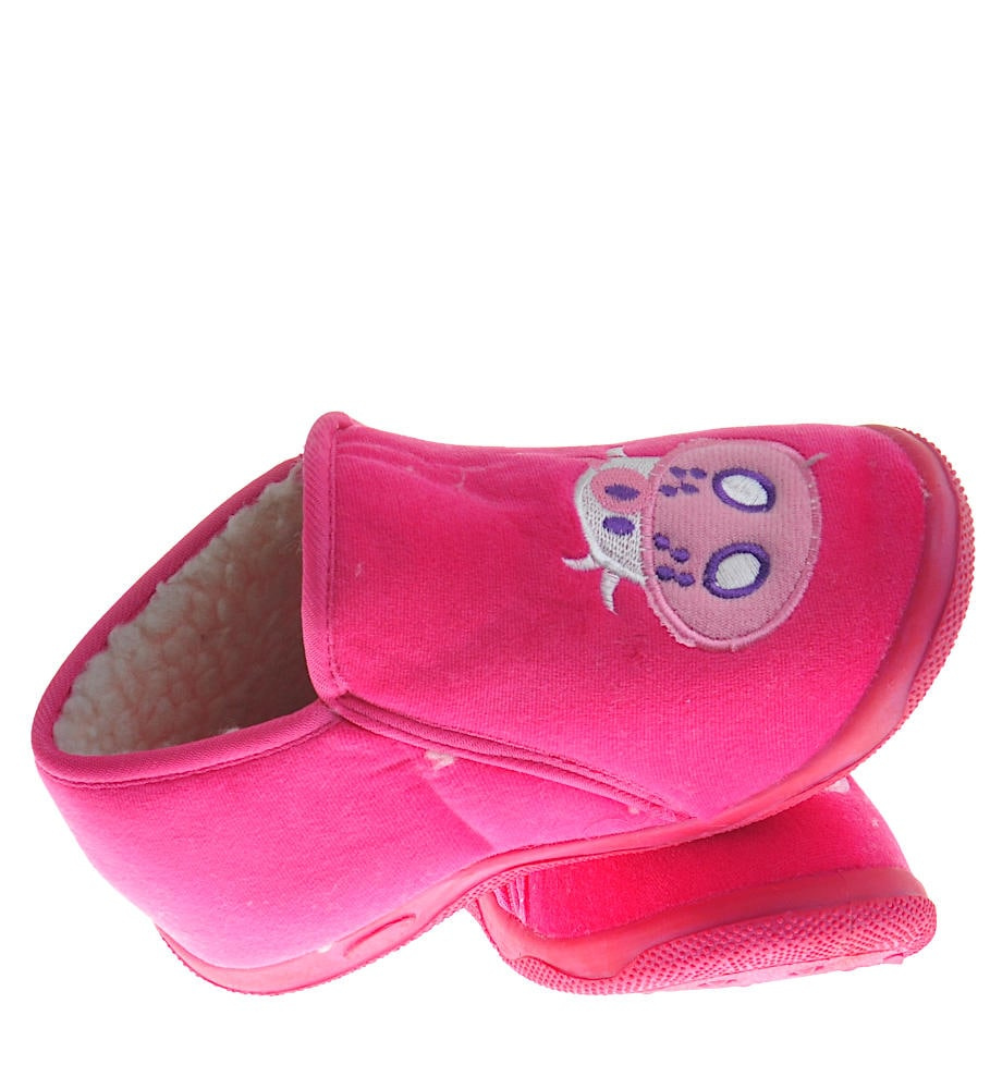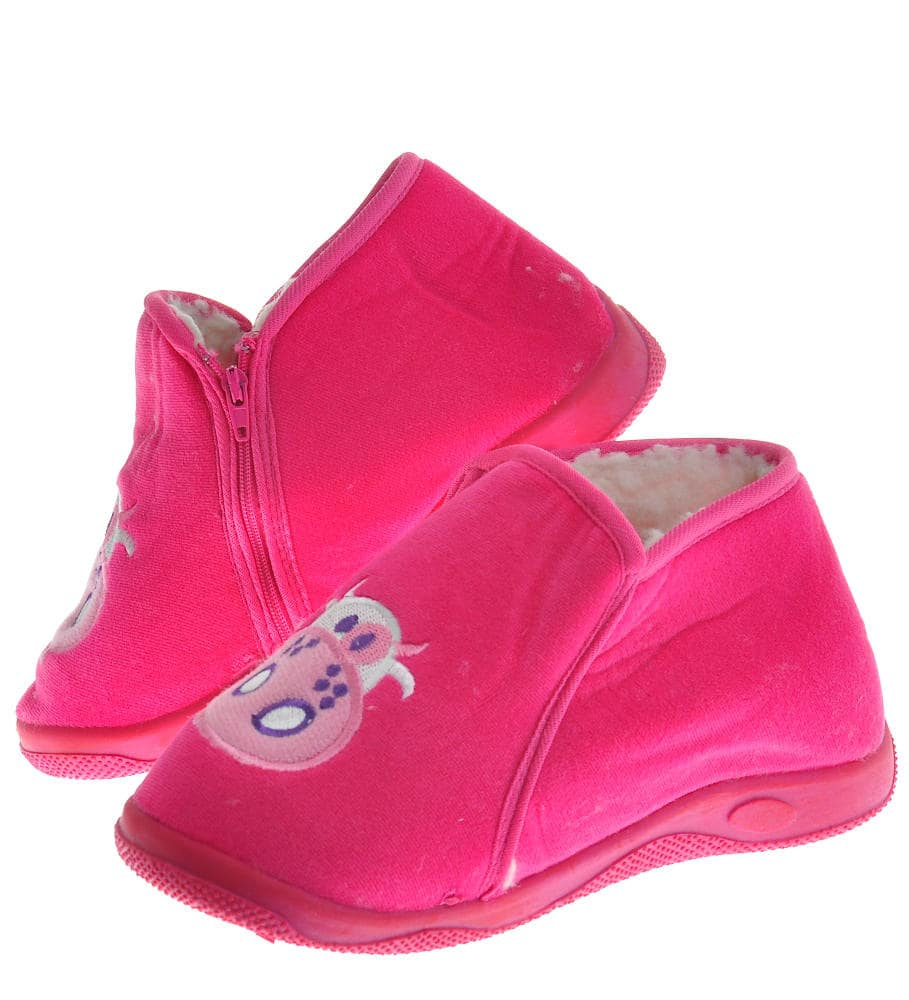 - Śliczne domowe kapcie wykonane z miękkiego, zamszowego materiału w kolorze fuksji.