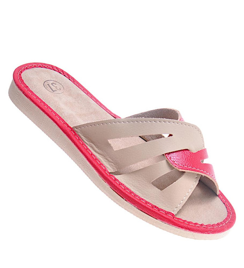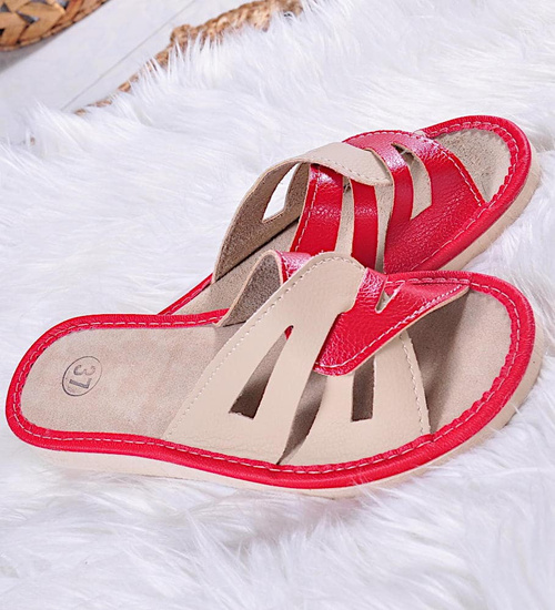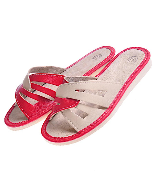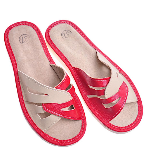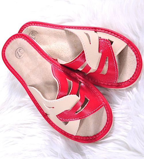 Czerwono-beżowe kapcie damskie z naturalnej skóry /E2-1 10861 S194/