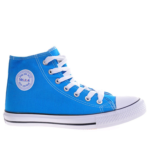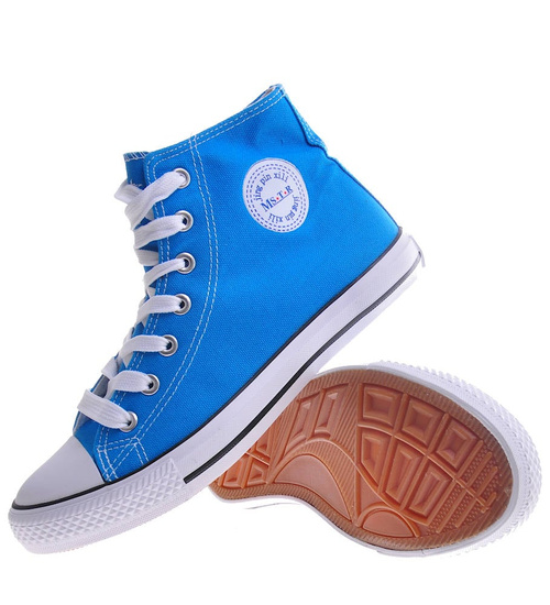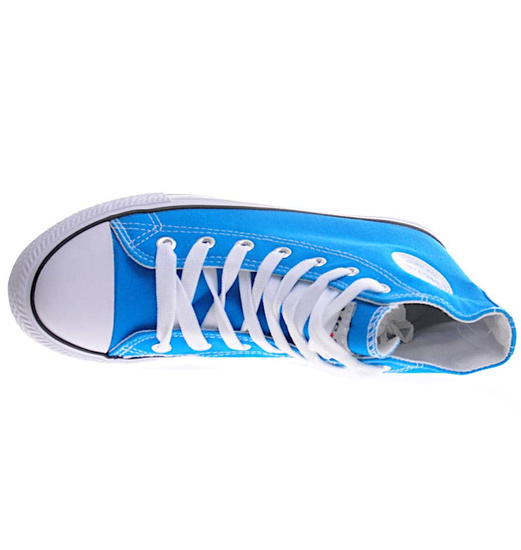 - Wysokie niebieskie trampki wykonane z miękkiej tkaniny- klasyczny fason do luźnych stylówek.