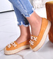 - Wierzch butów wykonano z zamszowego, ażurowego materiału w modnym, kamelowym kolorze.