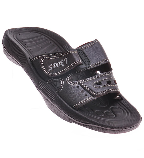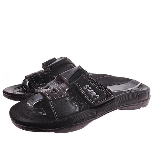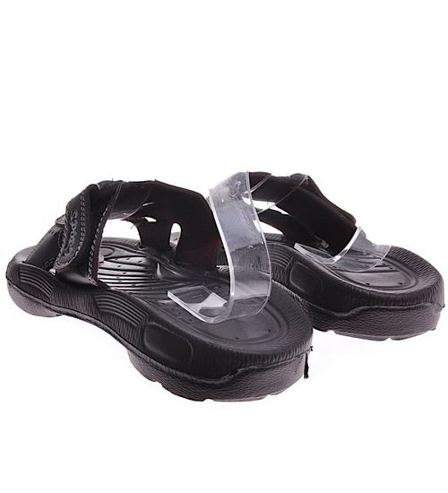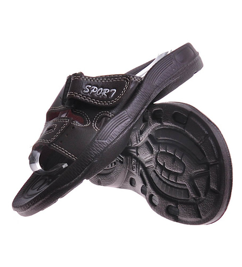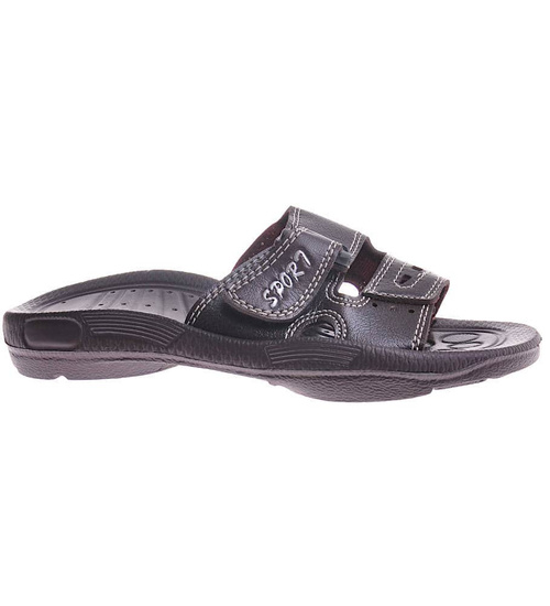- Brązowe chłopięce klapki zapinane na rzepy.