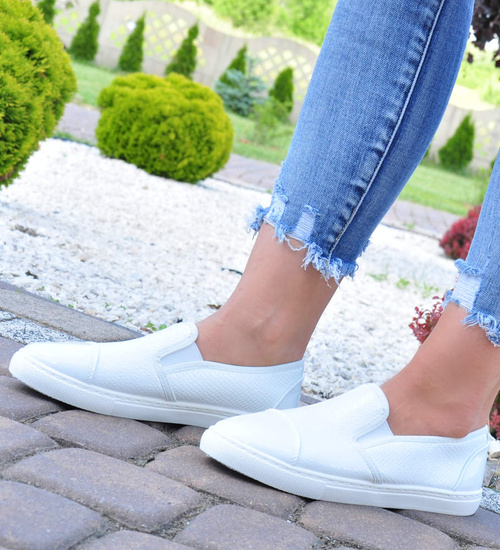 - Wsuwane damskie trampki typu slip on wykonane z ekologicznej skóry w białym kolorze.