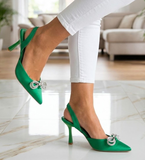 - Zielone szpilki na obcasie o umiarkowanej wysokości- ultra kobiece buty w najmodniejszym w tym sezonie kolorze.
