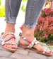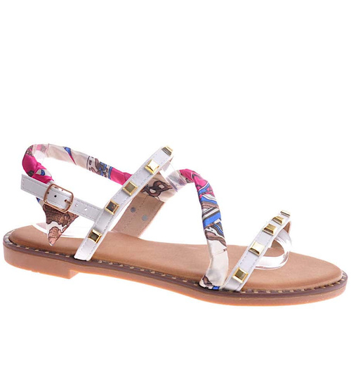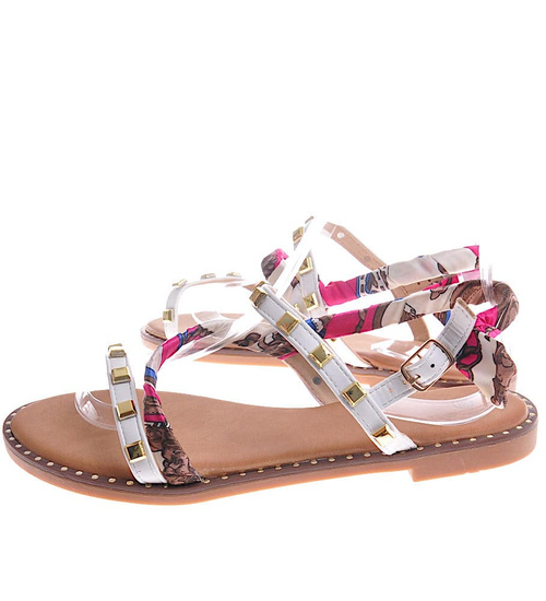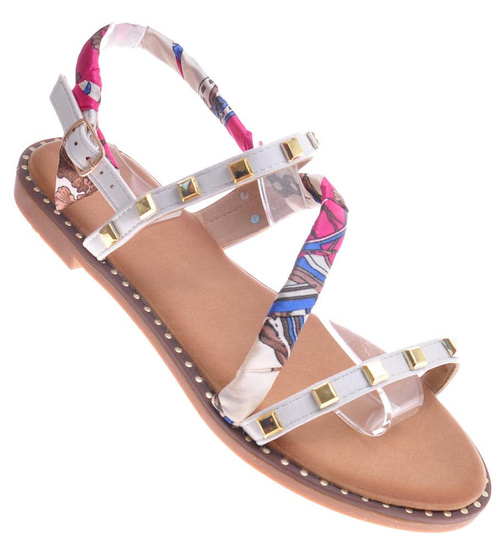 - Sandały na płaskim obcasie z przewagą koloru białego.