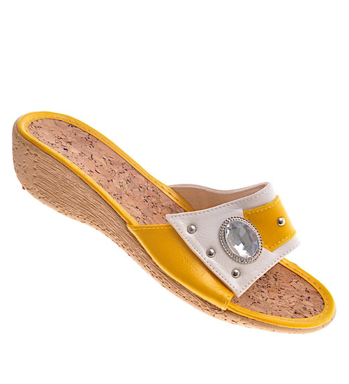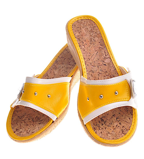 - Żółte klapki damskie na koturnie- wygodna propozycja do letnich zestawień.