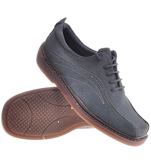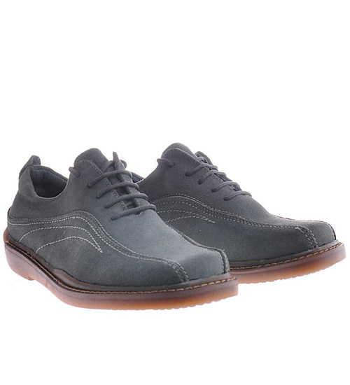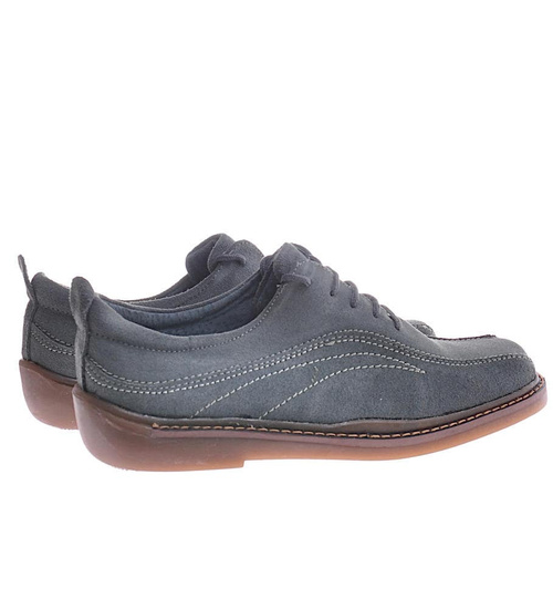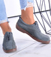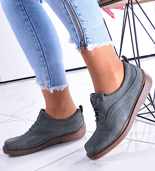 - Sznurowane damskie półbuty wykonane z zamszowego materiału w szarym kolorze.