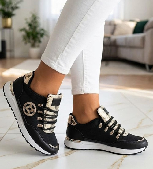 - Designerskie damskie buty sportowe wykonane ze skórki ekologicznej w kolorze czarnym ze złotymi dodatkami.