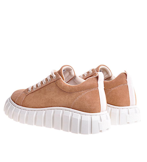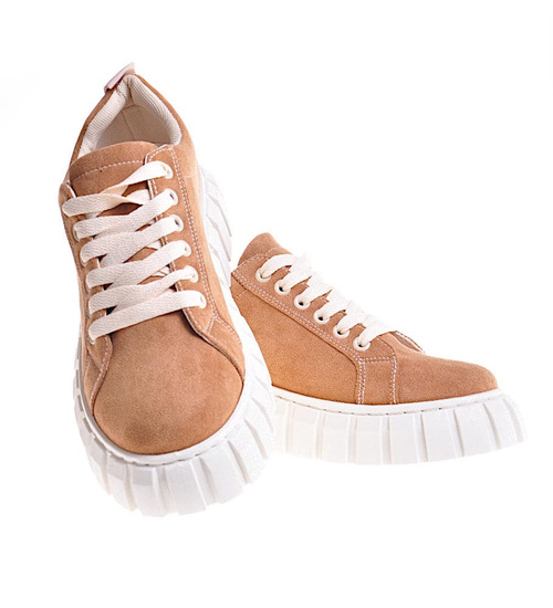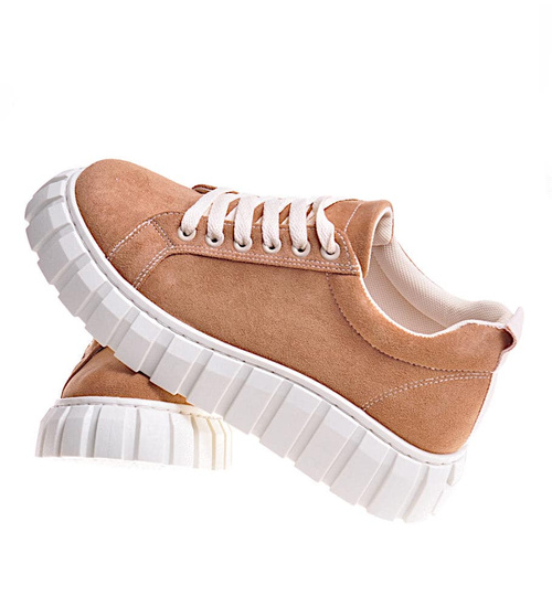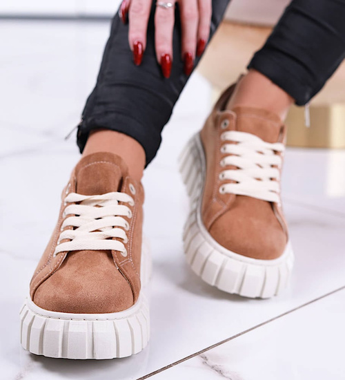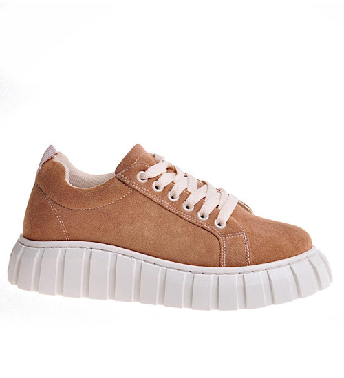 - Buty wykonane z skory ekologicznej zamszowej w kolorze camel.
