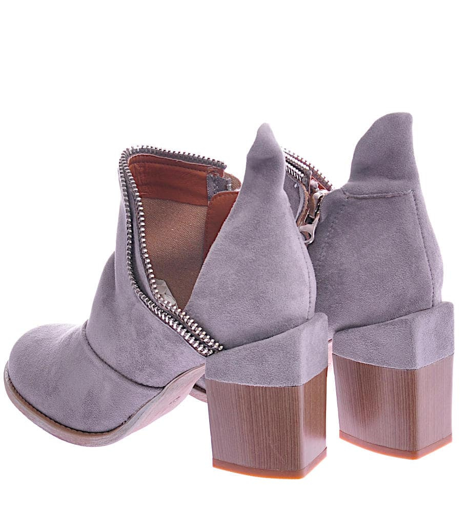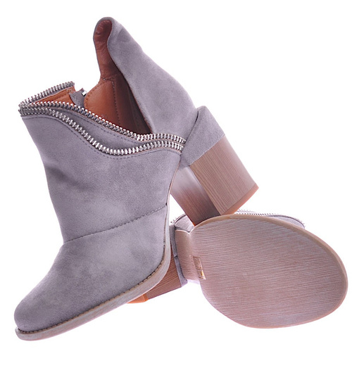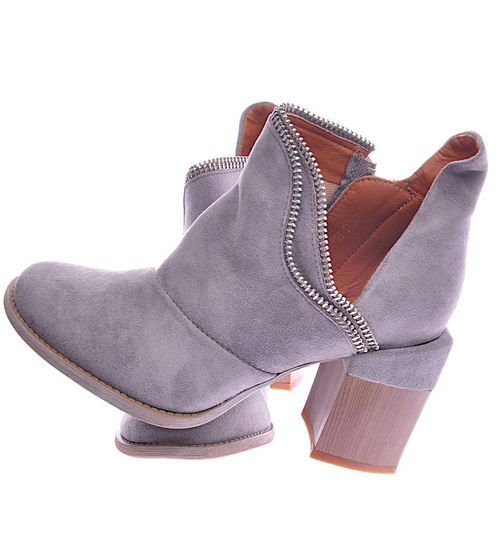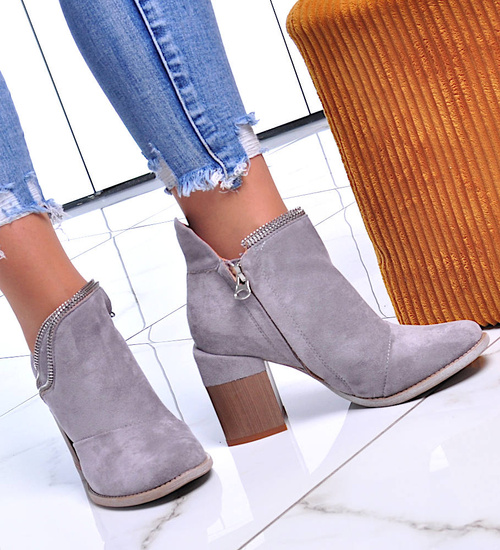 - Mega modne damskie botki na obcasie wykonane z zamszowej skóry ekologicznej w kolorze szarym.