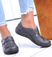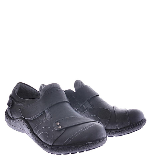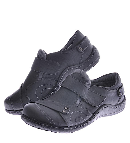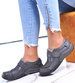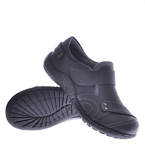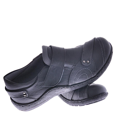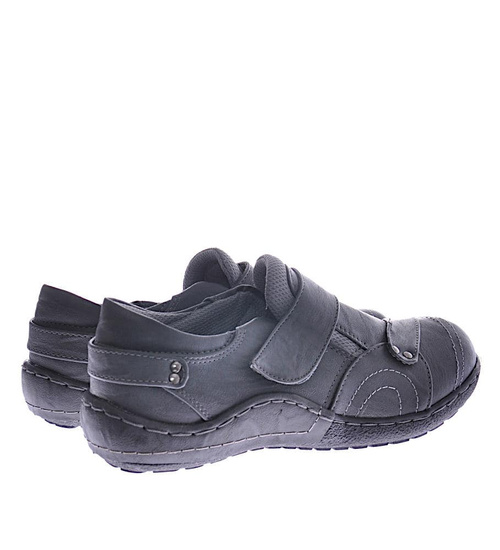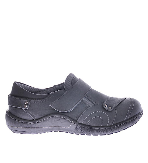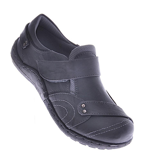 - Damskie półbuty wykonane z ekologicznej skórki w kolorze szarym.