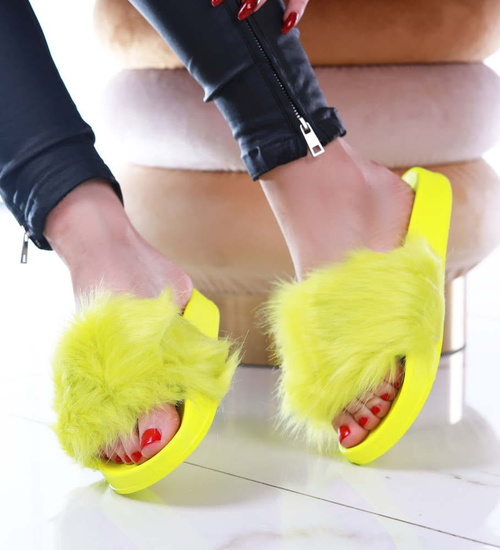 - Jasno zielone klapki damskie z futerkiem wykonane z miękkiego, przyjemnego w dotyku materiału.