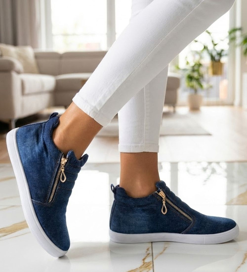 • Damskie trampki wykonane z jeansowej tkaniny w kolorze granatowym.