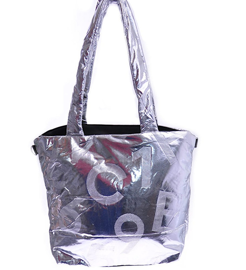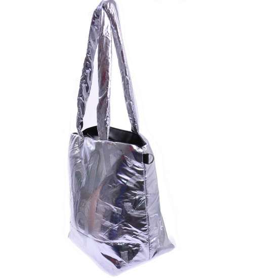 - Damska torebka Shopper Bag wykonana z miękkiego, błyszczącego materiału w srebrnym kolorze.