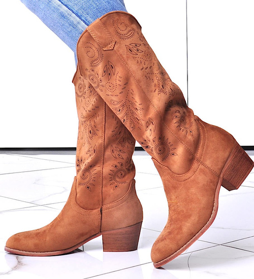 - Camelowe kozaki wykonane z skóry ekologicznej zamszowej.