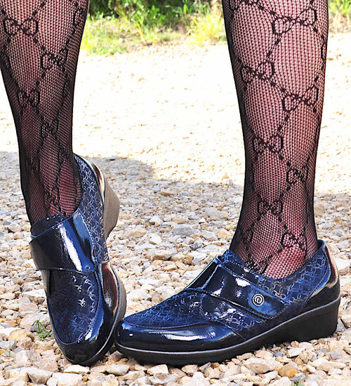 - Częśc obuwia wykonana z lakierowanej skóry ekologicznej jest w kolorze czarnym, natomiast wzorzysta część w kolorze granatowym.