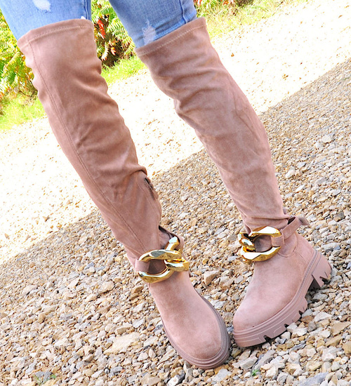 Wysokie zamszowe kozaki z łańcuchem Khaki /A5-1 12724 T707/