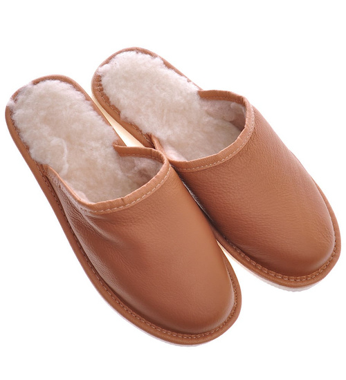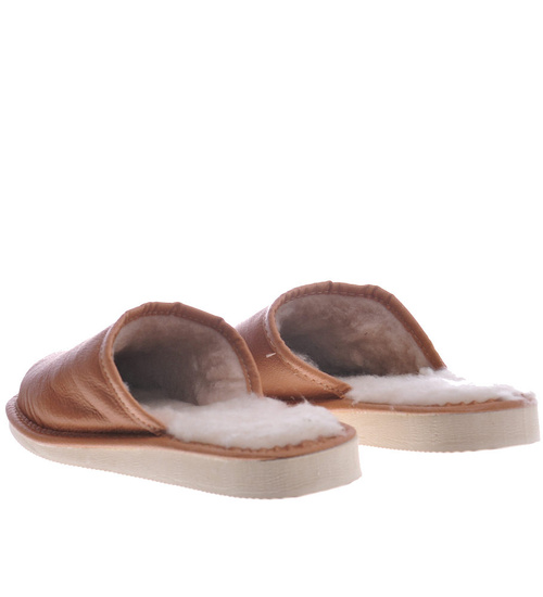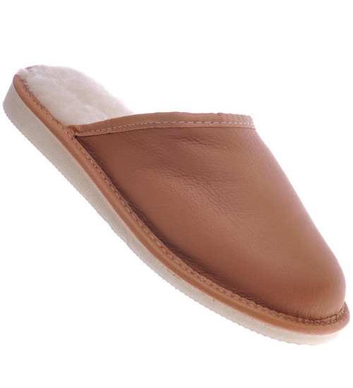 Skórzane brązowe kapcie damskie z wełną /C6-1 12796 S196/
