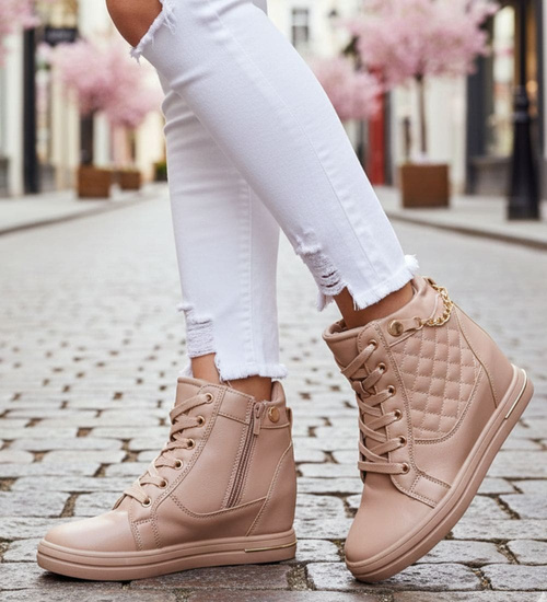 Beżowe sneakersy damskie na koturnie /F8-3 12771 T796/