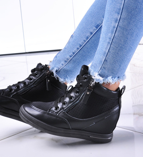 • Damskie czarne sneakersy na ukrytym koturnie.