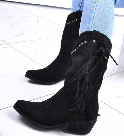 Kobiece kowbojki z frędzlami na niskim obcasie CZARNE /F3-2 12782 S493/